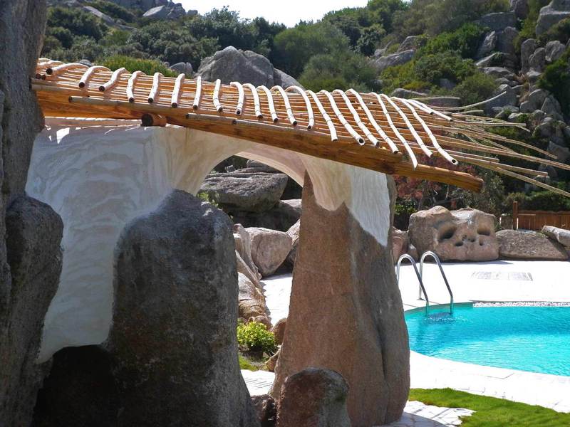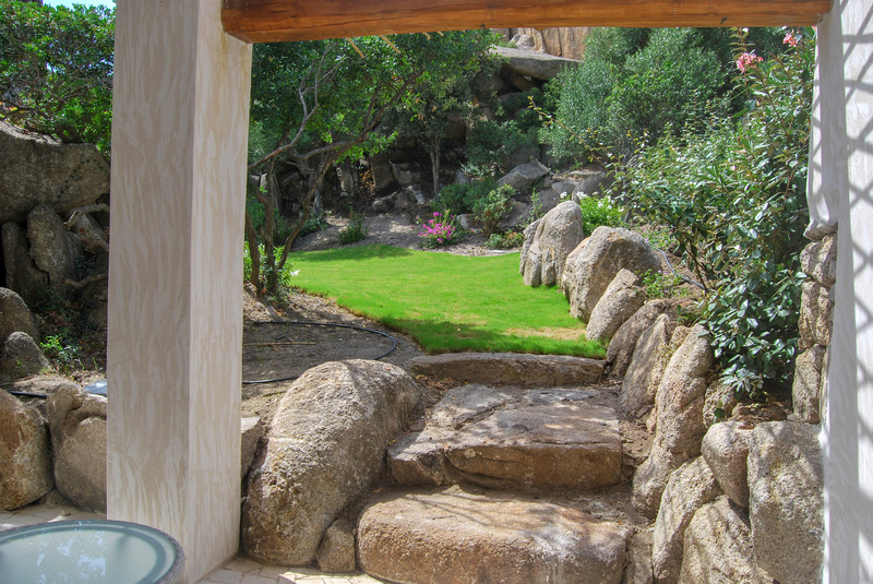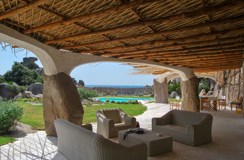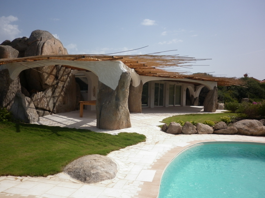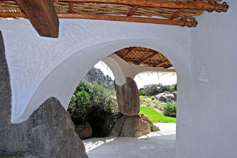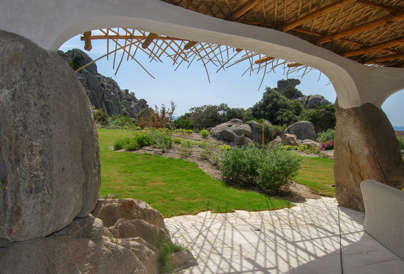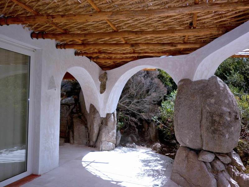 Una villetta caposchiera in un complesso anni '70 ed un contesto selvaggio, primitivo. Questa la situazione di partenza di questo intervento di ristrutturazione ed ampliamento. Le rocce sparse sul terreno, come se piovute dal cielo, sono state spunto di una rimodulazione completa degli spazi interni ed esterni di questa villa. L'edificio è stato abbracciato in tutto il suo perimetro da pergole in filagni di castagno e canne intrecciate, cucite singolarmente con il filo di rame per dare un manto che si adagiasse alla forma sinuosa degli archi che si susseguono sino a condurre lo sguardo degli ospiti ad uno scorcio di mare incorniciato da pareti rocciose e macchia mediterranea. Le pergole offrono nuove stanze esterne e diventano soggiorni, pranzo e zone relax immerse nel verde e si estendono sino all'area piscina. Colori e materiali sono quelli del luogo, calce bianca, granito eroso dal tempo, legno. All'interno lo spazio viene suddiviso in funzione sia della irripetibile vista sia delle necessità di comfort e funzionalità di una casa contemporanea. Un articolato sistema d'illuminazione esterna consente di apprezzare al meglio ogni angolo di questa villa anche di notte.