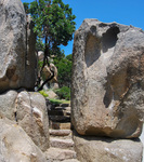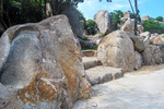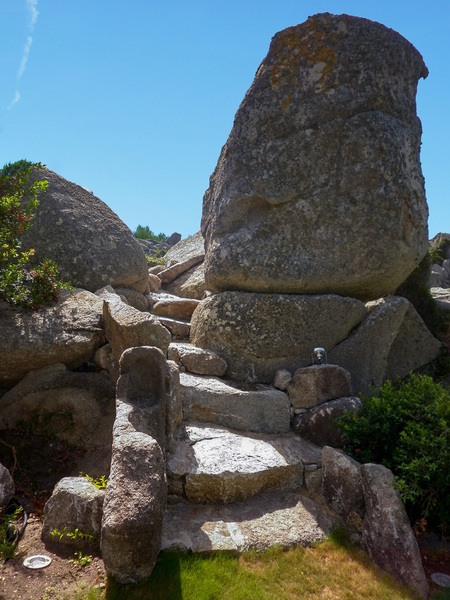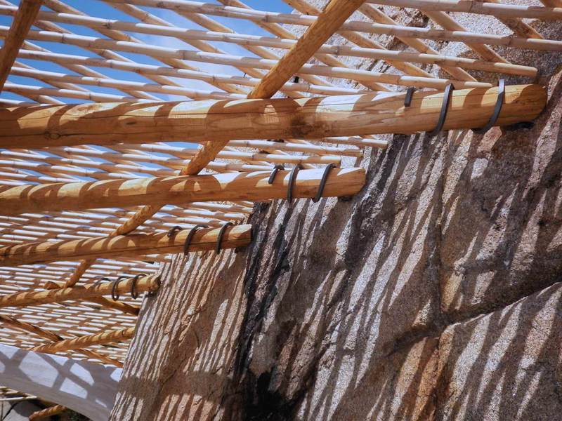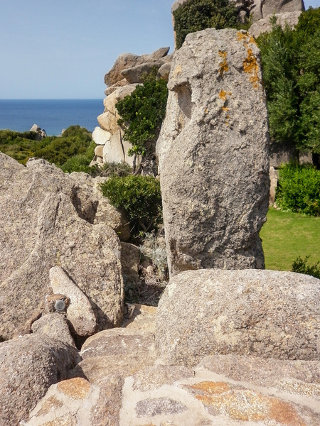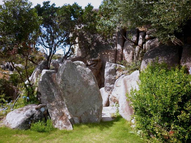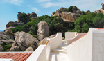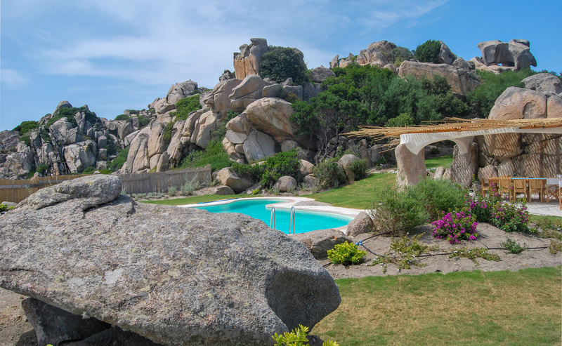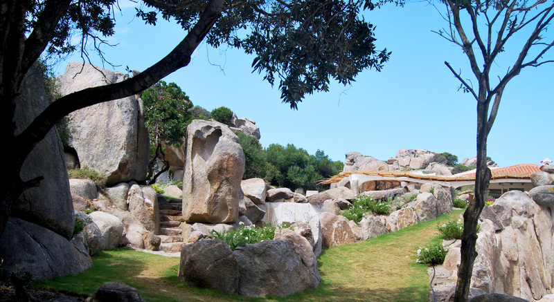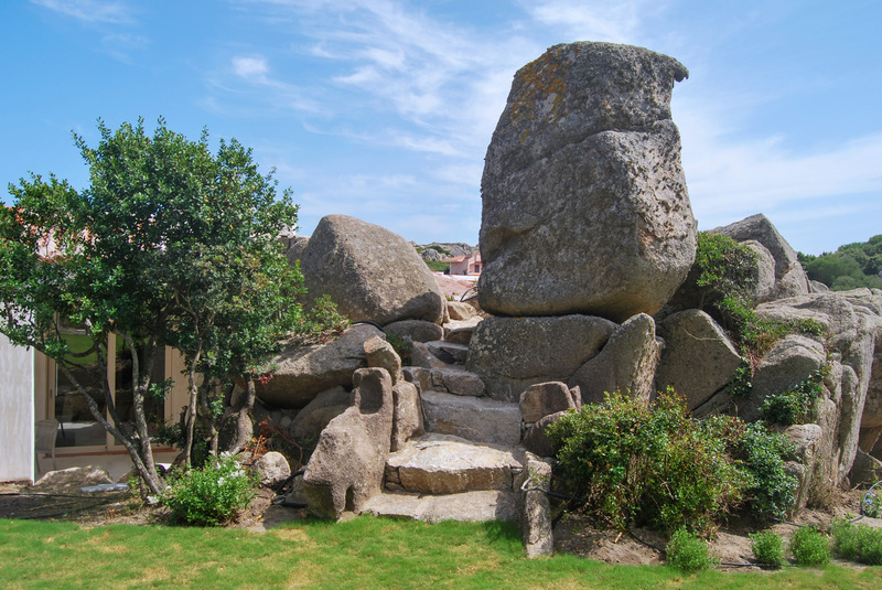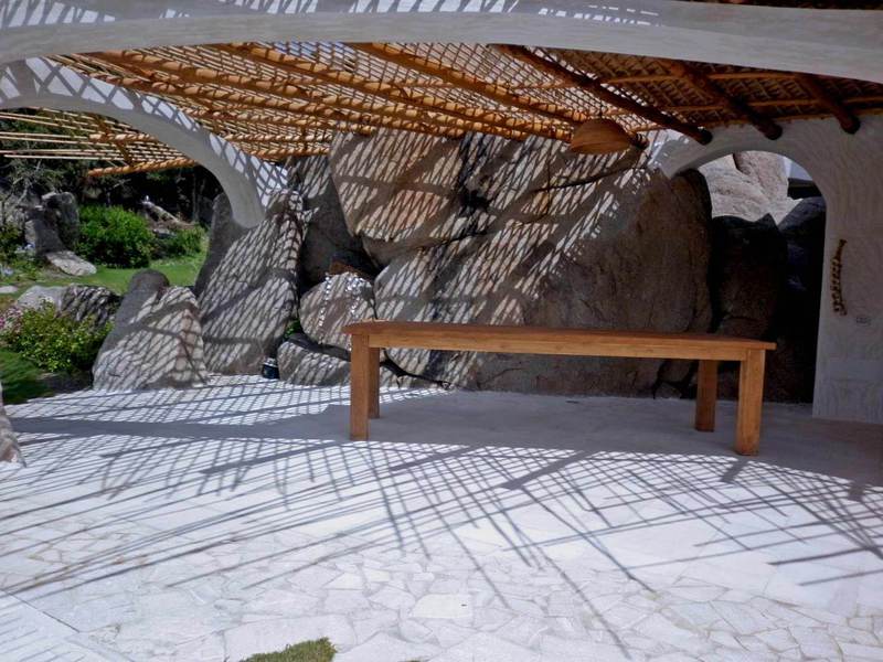 Una villetta caposchiera in un complesso anni '70 ed un contesto selvaggio, primitivo. Questa la situazione di partenza di questo intervento di ristrutturazione ed ampliamento. Le rocce sparse sul terreno, come se piovute dal cielo, sono state spunto di una rimodulazione completa degli spazi interni ed esterni di questa villa. L'edificio è stato abbracciato in tutto il suo perimetro da pergole in filagni di castagno e canne intrecciate, cucite singolarmente con il filo di rame per dare un manto che si adagiasse alla forma sinuosa degli archi che si susseguono sino a condurre lo sguardo degli ospiti ad uno scorcio di mare incorniciato da pareti rocciose e macchia mediterranea. Le pergole offrono nuove stanze esterne e diventano soggiorni, pranzo e zone relax immerse nel verde e si estendono sino all'area piscina. Colori e materiali sono quelli del luogo, calce bianca, granito eroso dal tempo, legno. All'interno lo spazio viene suddiviso in funzione sia della irripetibile vista sia delle necessità di comfort e funzionalità di una casa contemporanea. Un articolato sistema d'illuminazione esterna consente di apprezzare al meglio ogni angolo di questa villa anche di notte.