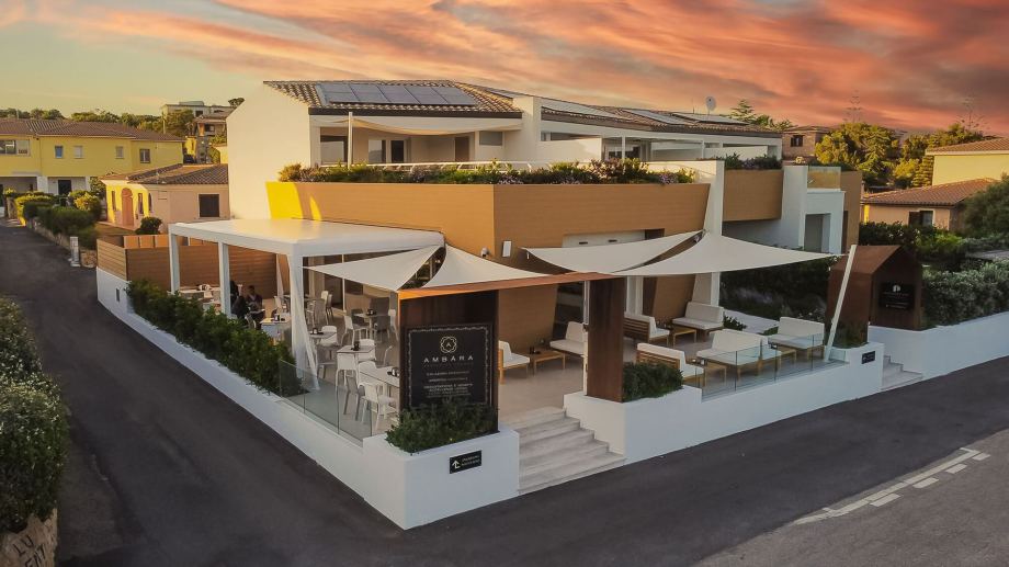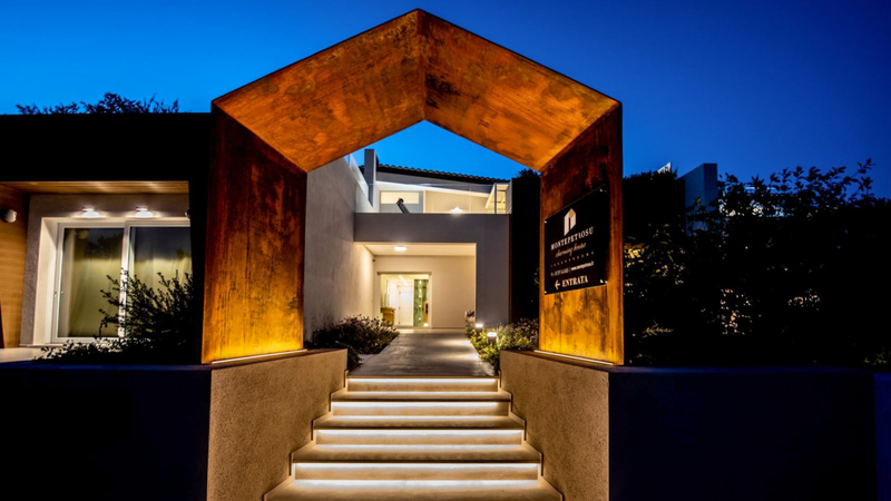 L’ingresso alla zona ricettiva trasmette immediatamente un richiamo all’archetipo della “domo” un volume netto realizzato in acciaio cor-ten che con le sue colorazioni calde richiama alla solidità ed al colore dei cristalli contenuti nel granito e ossidati dall’azione del mare.