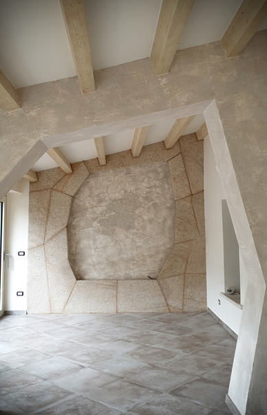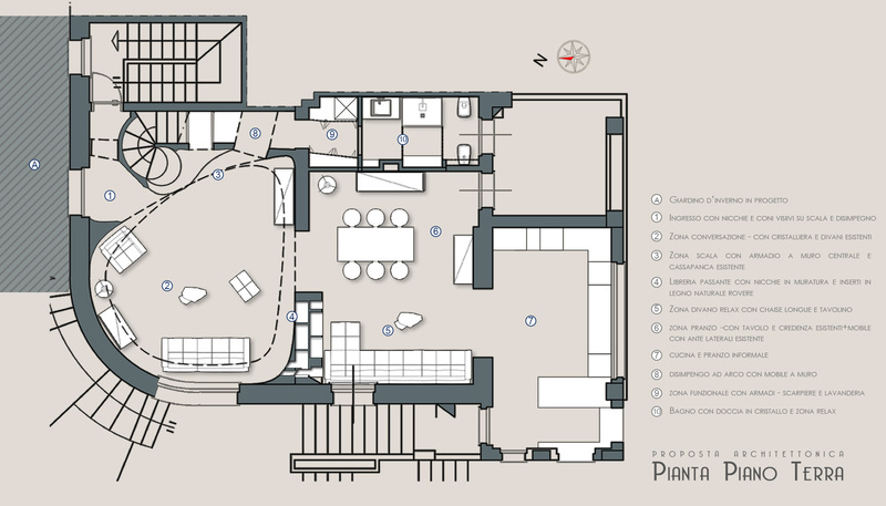 Una veranda coperta in un'abitazione anni 70, un po' fredda, spartana e con pochissima attenzione all'estetica, in controtendenza alle forte identità del luogo: Pattada. Ad oggi ha la funzione di filtro d'ingresso, ed è praticamente usata solo come passaggio e quindi non godibile nemmeno come spazio aperto. La committenza richiedeva un utilizzo come giardino d'inverno e soprattutto una netta modifica della percezione totale degli spazi. L'idea progettuale prevede la trasformazione in uno spazio accogliente e ricco di carattere. Un cannocchiale visivo che accompagni gli ospiti all'interno della casa, dando subito la sensazione di un ambiente piacevole e ricercato. Lamelle in legno naturale e con andamento irregolare correggono la pendenza della falda singola, armonizzando il volume e rendendolo parte integrante dell'abitazione esistente, eliminando la sensazione di elemento estraneo. Il pilastro esistente viene "vestito" da un arco rampante stilizzato con linee spezzate..che contribuiscono a portare lo sguardo verso il fulcro dell'ambiente..il secondo arco rampante realizzato in masselli di pietra locale! Un arco poltrona che avrà un vetro fisso satinato (qui trasparente per fornire emozionalità all'immagine). Sarà usato come angolo lettura e relax. Tutto lo spazio sarà in piena comunicazione con il giardino avendo previsto delle vetrate a tutt'altezza completamente apribili a libro. Fa parte dell'intervento anche la riorganizzazione degli spazi interni e nel dettaglio: la rimodulazione di tutta la zona giorno, comprensiva di bagni, e nella zona notte la modifica della camera padronale, del bagno e la realizzazione di una camera per ragazzi, ricavata dall'attuale studio, pensata come un vero rifugio, e che riprende i motivi dell'idea progettuale generale, uniformando l'intero intervento.