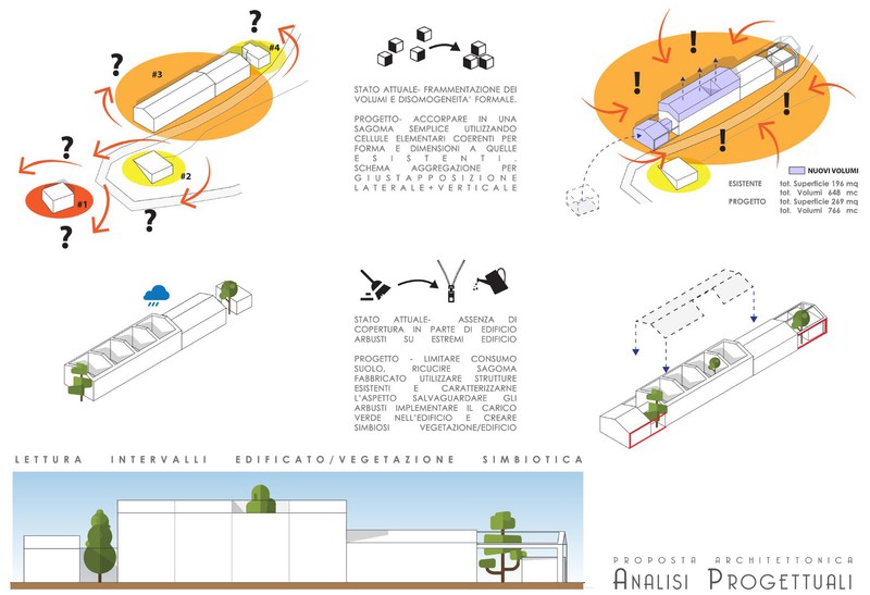 Due fattori importanti hanno guidato la scelta progettuale: la presenza di due arbusti sulle facciate laterali del corpo di fabbrica, e la mancanza totale di copertura nella porzione ovest. Per preservare gli arbusti e integrarli nell’ampliamento, si è deciso di sviluppare in altezza, limitando il consumo di suolo e massimizzando il riutilizzo delle strutture esistenti. Nell’ampliamento è stata conservata una porzione del fabbricato “a cielo aperto” che permette la presenza del verde interno al fabbricato ricreando “la corte”. Elemento fondamentale è stata poi la riconnessione dei vari corpi di fabbrica, esistenti ed in progetto, attuata sia a livello formale sia e soprattutto a quello storico/culturale.